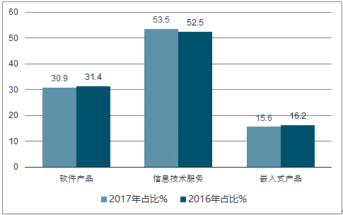 2017年8月止,软件产品实现收入10680亿元,同比增长12%,占总营收的30.9%;信息技术服务实现收入18510亿元,同比增长16%,占总营收的53.5%;嵌入式系统软件实现收入5412亿元,同比增长10.1%,占总营收的15.6%。