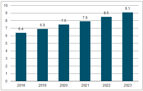 在国家高度重视和大力扶持下,软件行业相关产业促进政策不断细化,资金扶持力度不断加大,知识产权保护措施逐步加强,软件行业在国民经济中的战略地位不断提升,行业规模也将不断扩大。预测到2023年软件行业市场规模或将达到9.1万亿元。