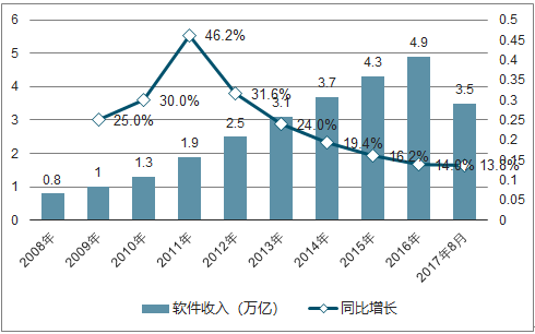 2016年软件业务收入保持较快增长,完成软件业务收入4.9万亿元,同比增长13.95%,增速同比回落2.26个百分点。2017年1-8月我国软件和信息技术服务业共完成软件业务收入3.5万亿元,同比增长13.8%。